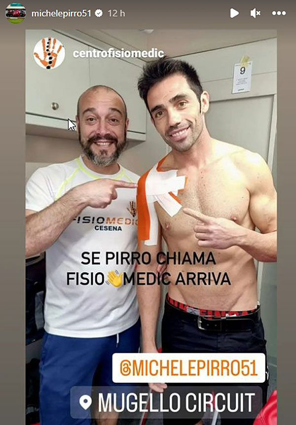 « Salut les gars, hier j’ai subi une mauvaise chute au Mugello à Arrabbiata 2. Je me suis disloqué l’épaule droite et ai eu diverses contusions, mais grâce centre médical du circuit et aux hommes de la polyclinique de Modène dirigée par les Docteurs Cattani et Porcellini, et avec l’aide du physiothérapeute, j’ai pu reprendre la piste aujourd’hui. Je veux vous rassurer, je serai là dans deux semaines au GP d’Italie au Mugello. Merci à tous pour les messages de soutien. »