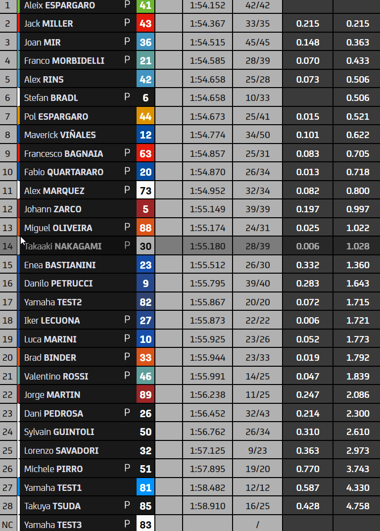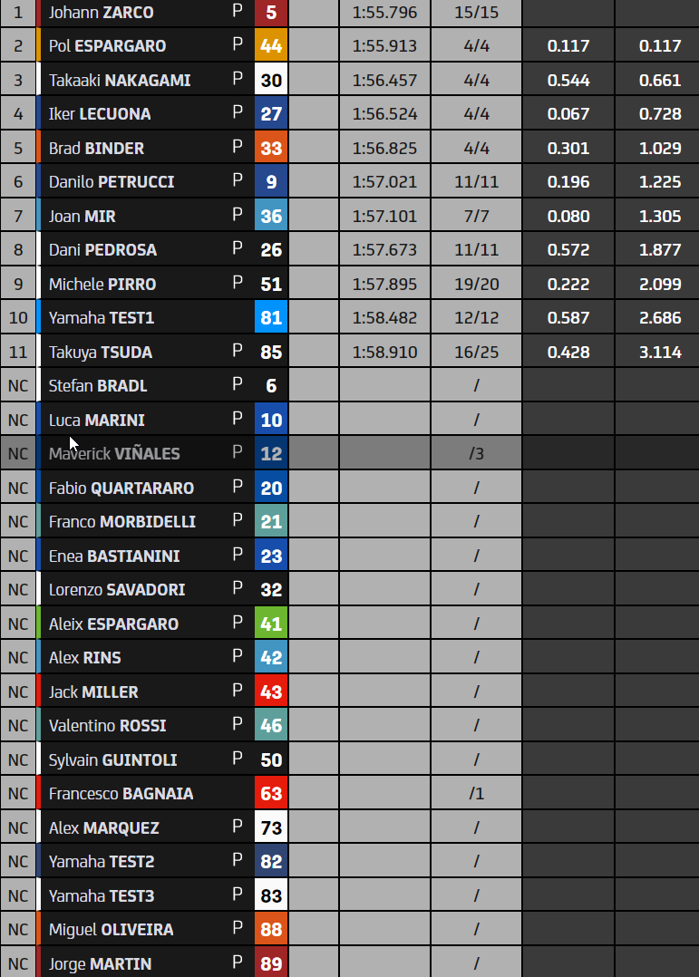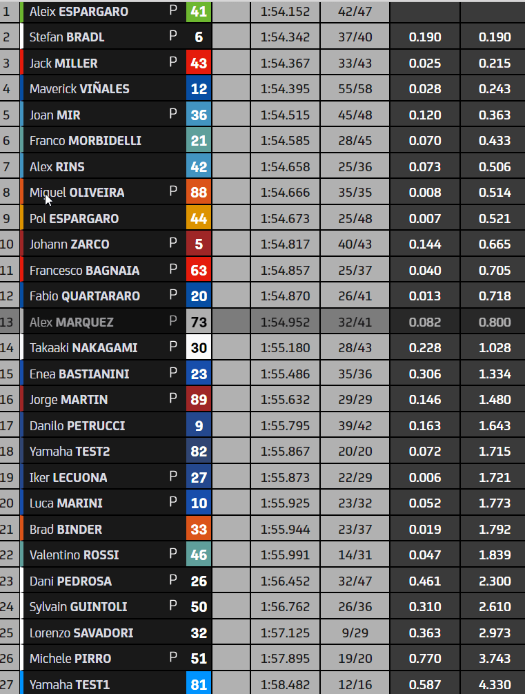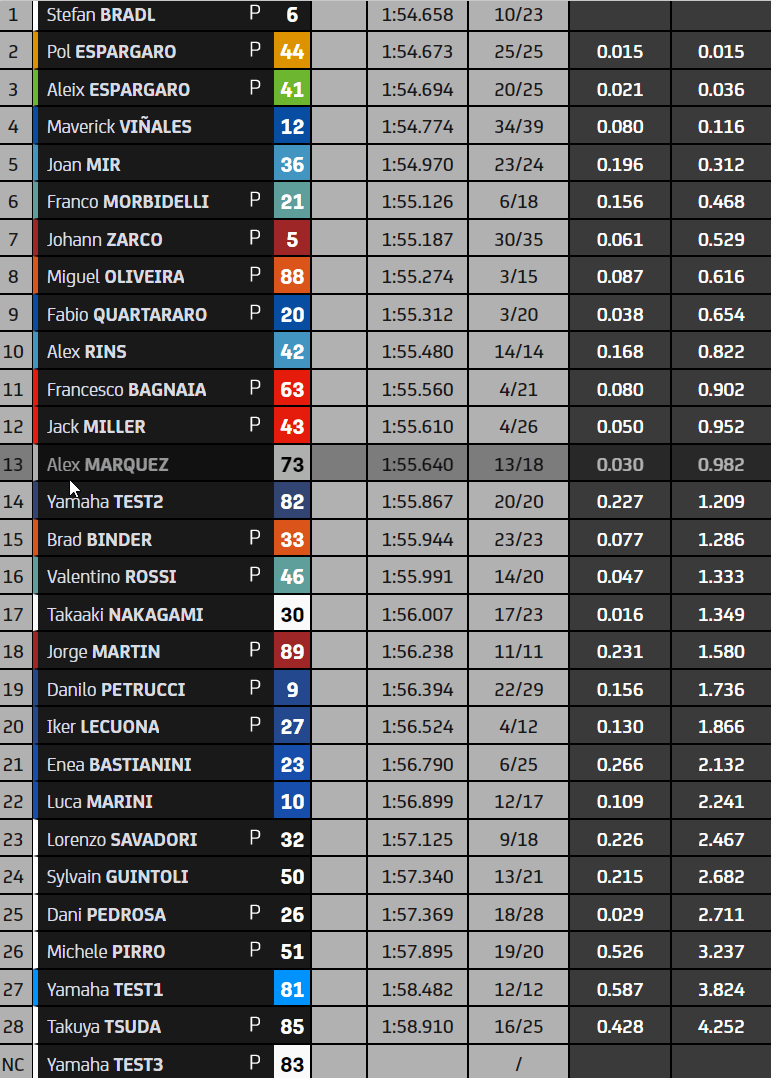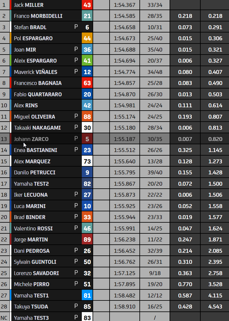 Côté écueils, on a vu lors de cette seconde journée un Alex Marquez et un Pecco Bagnaia à terre, un Jorge Martin souffrant du cou à la suite de sa chute du vendredi, un Petrucci en difficultés sur sa KTM comme un Pol Espargaró peu à l’aise sur sa Honda. Les Yamaha sont aux abonnées absentes puisque le constructeur ne fait pas partie d’un top 5 composé de cinq marques différentes.
