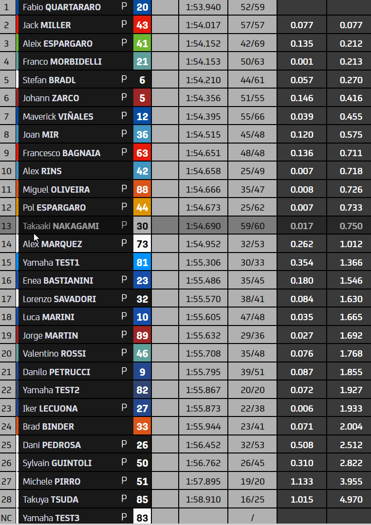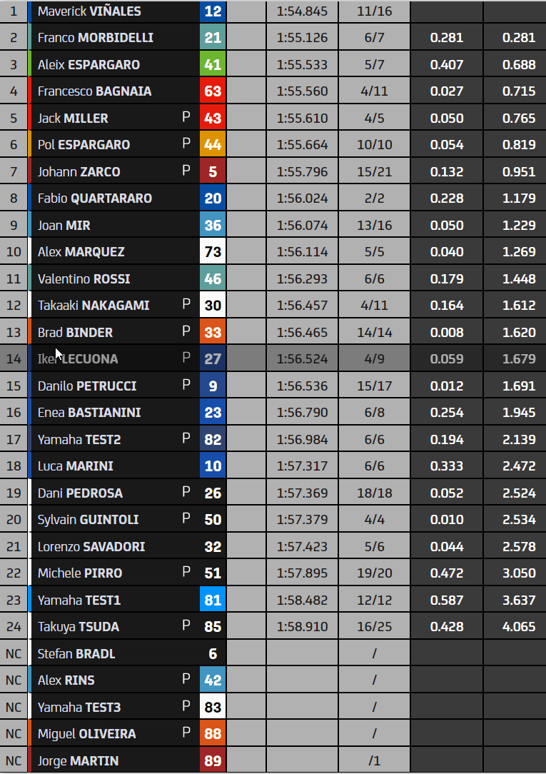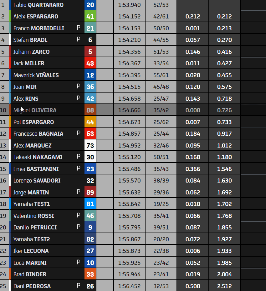 A 90 minutes du but, Stefan Bradl met un coup de collier et s’installe second derrière l’Aprilia. Miller, Vinales et Mir forment le top 5. Morbidelli mène le reste du peloton. Johann Zarco boucle le top 10. Quartararo est douzième, devant Alex Marquez qui tient en respect Nakagami. Bastianini quinzième mène le bal des débutants. Rossi est un anonyme vingt-deuxième.