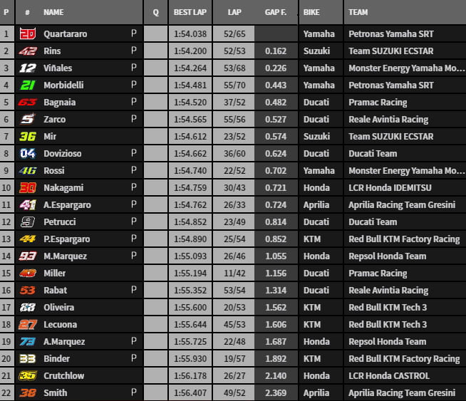 Avec Fabio Quartararo en première position et Maverick Viñales à la troisième place, sans oublier Valentino Rossi qui a évolué dans le haut du classement au cours de la journée, les Yamaha sont réellement en forme durant cette pré-saison, tout comme les Suzuki. Reste à voir si tout cela se confirmera demain et surtout lors du premier Grand Prix de la saison, dans deux semaines.