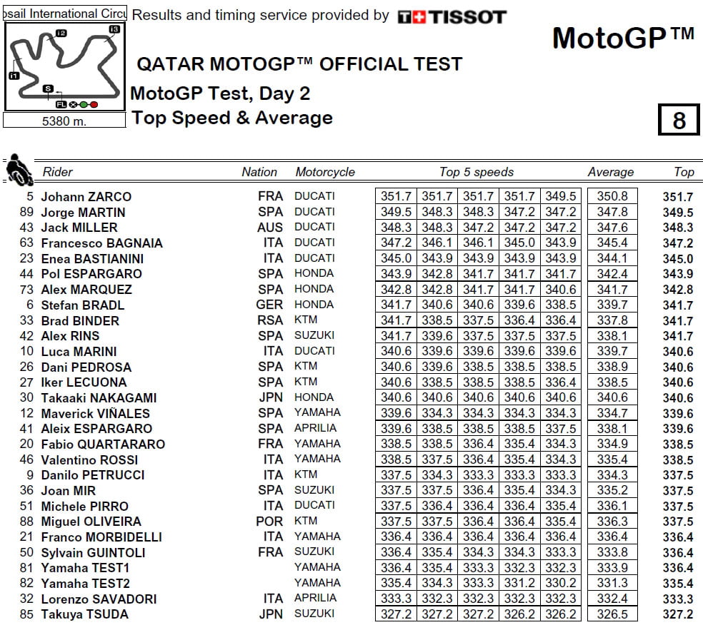 L’année dernière, les vitesses étaient même un petit peu plus élevées au terme de trois journées d’essais moins venteuses, Ducati atteignant 355,2 km/h avec Jack Miller et Yamaha 346,1 km/h avec Maverick Viñales (sans doute en aspiration).