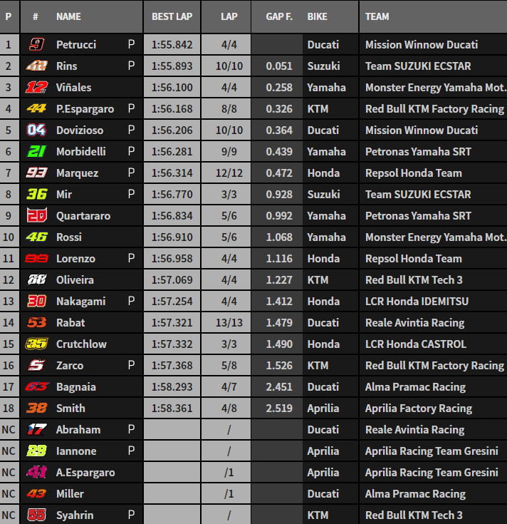 Danilo Petrucci, Aleix Espargaró et Miguel Oliveira ont officiellement terminé leurs essais. Seuls sont encore en piste Takaaki Nakagami qui, une fois de plus, intègre le Top 10, Cal Crutchlow et  Andrea Iannone qui naviguent en 16e et 17e positions, ainsi que Bradley Smith.