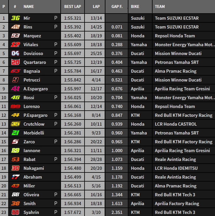 Sauf Álex Rins, qui inscrit 1’57.938 dès son premier tour lancé et 1’56.625 au deuxième. Même s’il a déclaré qu’il y avait 19 Grands Prix pour amener la Suzuki à la victoire, gageons qu’il fera tout pour le faire dans 2 semaines…