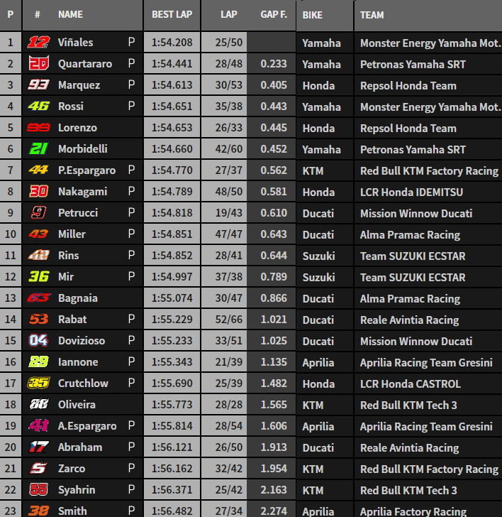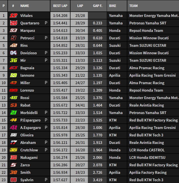 Tito Rabat se place 5e, Fabio Quartararo 7e et, et Álex Rins reprend le commandement en 1’54.852, reléguant le reste du plateau à plus de 4 dixièmes.