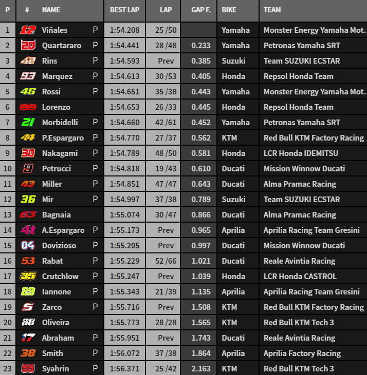 Valentino Rossi passe P4. Il y a maintenant 3 Yamaha dans les 4 premiers, tandis que Franco Morbidelli passe un peu à côté de sa séance, en 15e position.Du coup, les Suzuki qui dominaient tout à l’heure sont provisoirement 7e et 8e mais perdent une place quand Jorge Lorenzo vient placer sa Honda en 4e position.