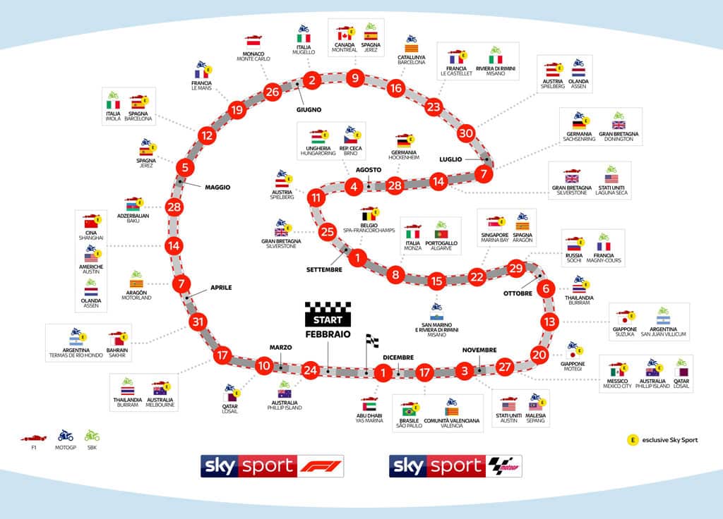 A l’heure où on s’inquiète de la juxtaposition de la F1 et du MotoGP sur Canal+, Sky Italie vient de présenter son programme de 53 courses en direct comprenant F1 + MotoGP + Superbike, avec Mattia Pasini comme consultant Moto2 !