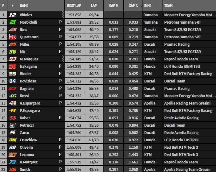 Le double champion du monde de Moto2 déclare : « tout le monde est rapide, mais nous ne sommes pas loin. Cela fait aussi longtemps que je n’ai pas fait de longues séries de tours sur la moto. Je dois ressentir cette sensation sur une distance de treize tours ou plus et m’amuser à le faire. Ce sentiment vient lentement et j’en suis heureux. »