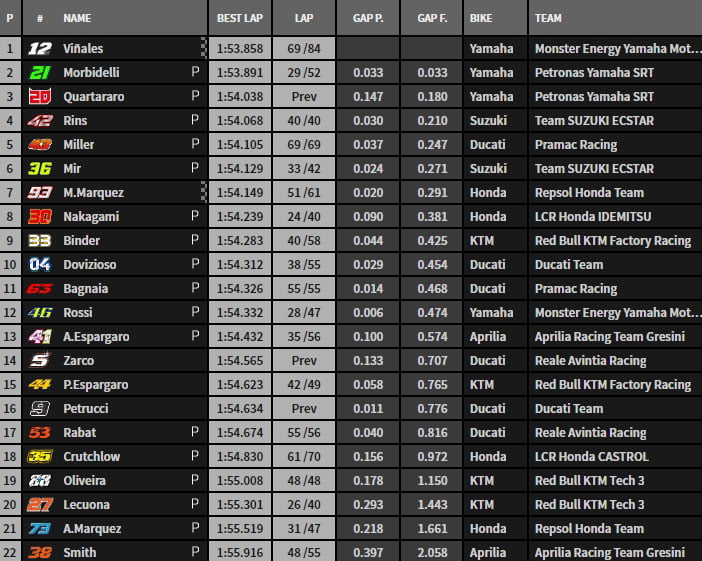 L’Espagnol de 27 ans, qui a terminé septième avec un écart de 0,291 seconde sur la Yamaha de Viñales, était sensiblement soulagé lundi soir : « je suis très heureux. Pour être honnête, dimanche et le premier jour, la situation m’a beaucoup inquiété, sur le plan technique et physique. Nous avons fait un grand pas, nous avons compris beaucoup, beaucoup de choses. On pouvait voir que dans le rythme et le temps au tour, tout était plus facile. La moto était également moins exigeante pour ma condition physique. »