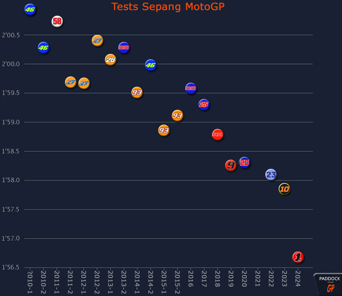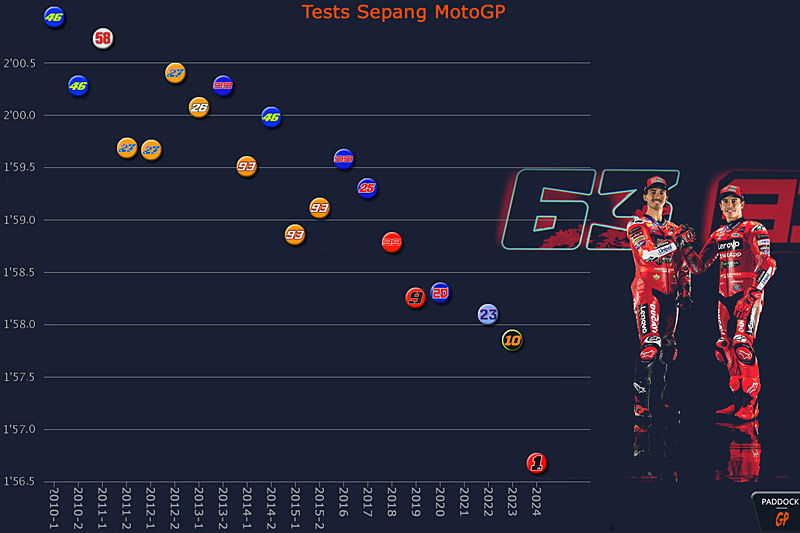 Enfin, en 2024, la Desmosedici démontrait un véritable bond en avant, en améliorant la référence de plus d’une seconde, au mains de Francesco Bagnaia : 1’56.682 !