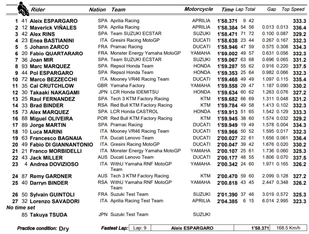 « Il nous faut plus de temps, c’est difficile à dire. Aprilia est sur place depuis une semaine, mais me concernant je n’ai bouclé qu’une quarantaine de tours. Maverick Viñales a pour sa part roulé pendant trois ou quatre jours, mais pour ma part je n’ai roulé qu’une journée. J’ai beau avoir réalisé mon meilleur temps dès mon sixième ou septième tour lancé [sic, à son neuvième tour], j’ai par la suite eu pas mal de soucis avec la moto.