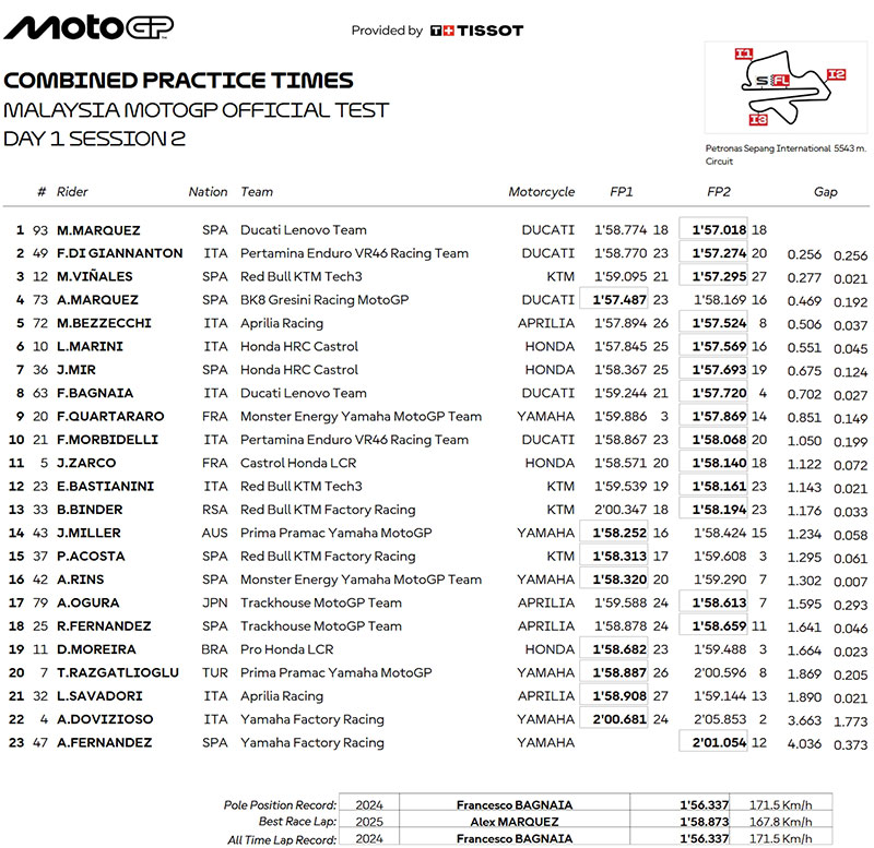 Résultats combinés du premier jour de test de Sepang :
