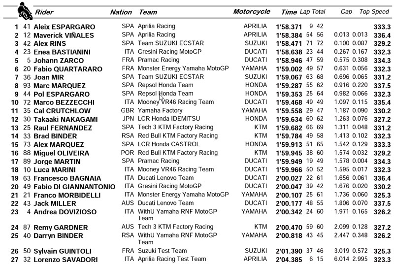 La première journée du test MotoGP à Sepang s’est terminée avec le classement suivant :