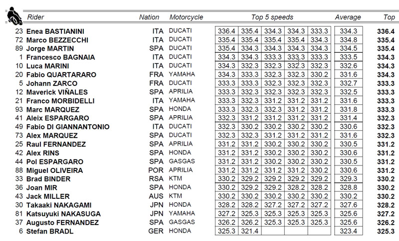 Concernant les vitesses de pointe, un sujet particulièrement sensible pour les Yamaha, le site officiel MotoGP.com publie le tableau récapitulant les cinq meilleures vitesses de pointe pour chaque pilote et la moyenne engendrée.