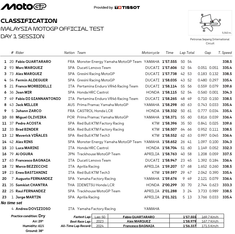 Classement du test MotoGP à Sepang J1 :