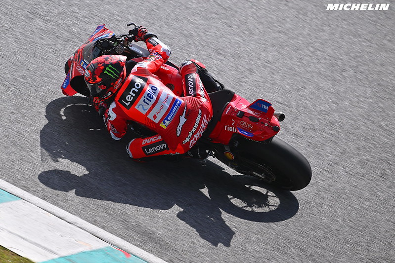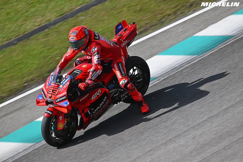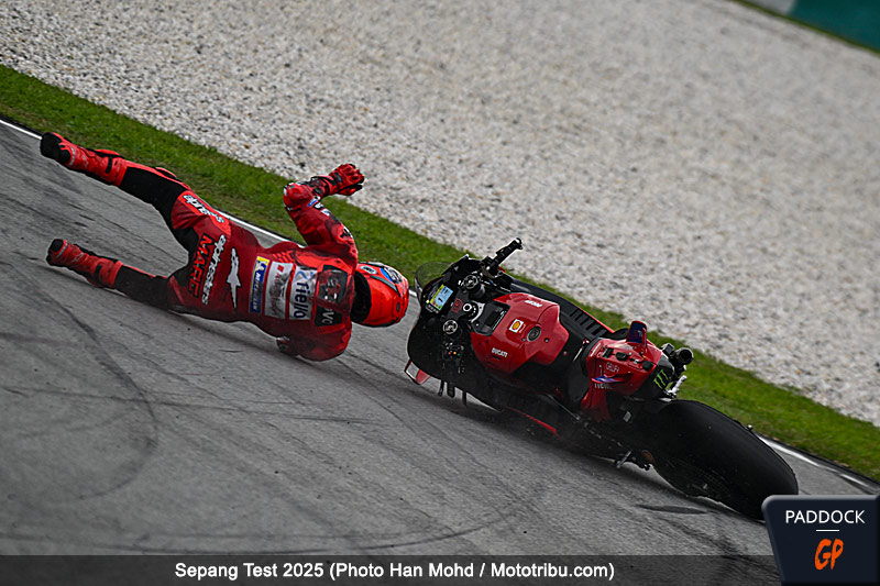 Francesco Bagnaia (Ducati Lenovo Team) est cinquième, après que le double champion se soit classé 17e le premier jour. Il était globalement satisfait de sa journée de travail malgré une chute ayant entraîné une grosse perte de temps ce jeudi, une perte de l’avant peu spectaculaire dans le virage 15. Comme pour son coéquipier Marc Marquez classé bien plus loin que la veille, le plan de travail est clairement établi : validation du moteur 2025-2026 qui offre une bien meilleure accélération mais reste inférieur au 2024 au freinage, pré-validation d’une solution aérodynamique, puis s’il reste du temps, validation du nouveau châssis et des nouveaux freins Brembo. Son coéquipier Marc Marquez (Ducati Lenovo Team) a également chuté, lui au virage 9 plus tard dans la journée, après avoir eu un problème technique au virage 2.