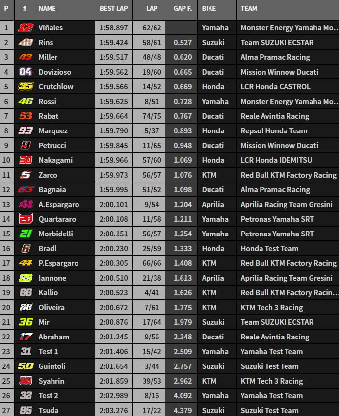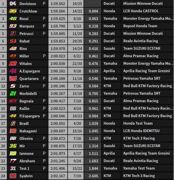 Jack Miller leur offrait une opposition de qualité en réalisant le troisième temps en 1’59.517 à 0.6 de Viñales, se classant ainsi premier pilote indépendant. Il précédait par exemple les deux Ducati GP 19 d’Andrea Dovizioso et de Danilo Petrucci. Seule une petite chute contrariait sa progression, sans conséquence grave.