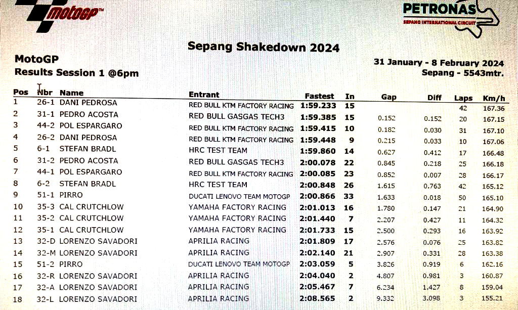 MotoGP Test Sepang Shakedown J1 : chronos