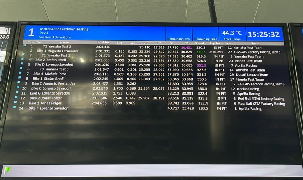 Le rookie Augusto Fernandez est 2e à 0″185 de la M1 de tête, devançant notamment Stefan Bradl et sa Honda, 4e temps de la matinée. Pour Aprilia, il y a Lorenzo Savadori (2’01″646), tandis que Ducati s’appuie sur Michele Pirro, qui entame aujourd’hui sa 11e saison comme testeur pour la marque de Borgo Panigale. Son meilleur temps est de 2’02″115.