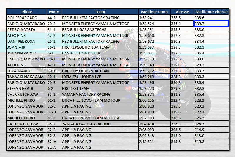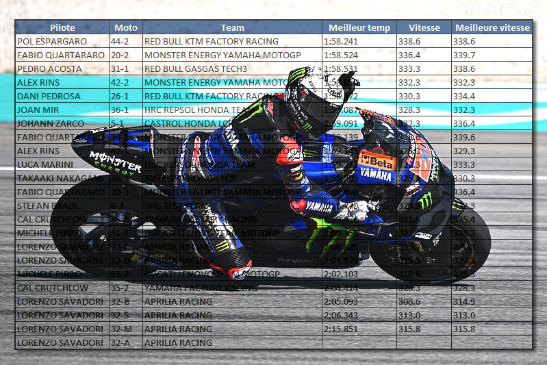 Fabio Quartararo y figure aux deux premières positions, avec 339.7 km/h au guidon de la 20-2, et 339.6 sur la 20-1, prenant ainsi plus de 10 km/h à la Ducati hyper chargée aérodynamiquement.