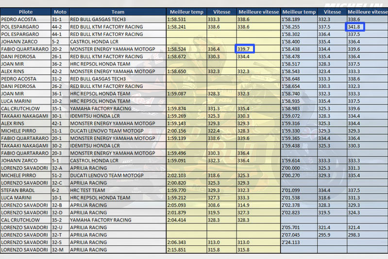 Bonne nouvelle pour les passionnés français, Fabio Quartararo semble confirmer les progrès de la M1, obtenant quasiment la même vitesse de pointe que la veille, 339.6 contre 339.7.
