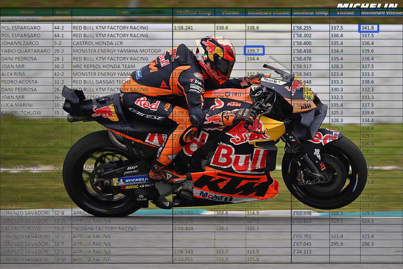 Mais la concurrence montre « qu’elle en a dans la poignée », Pol Espargaro (Red Bull KTM Factory Racing) désormais pilote d’essai affichant pas moins de 341.8 km/h, alors que Pedro Acosta n’était pas bien loin, en 338.6 !