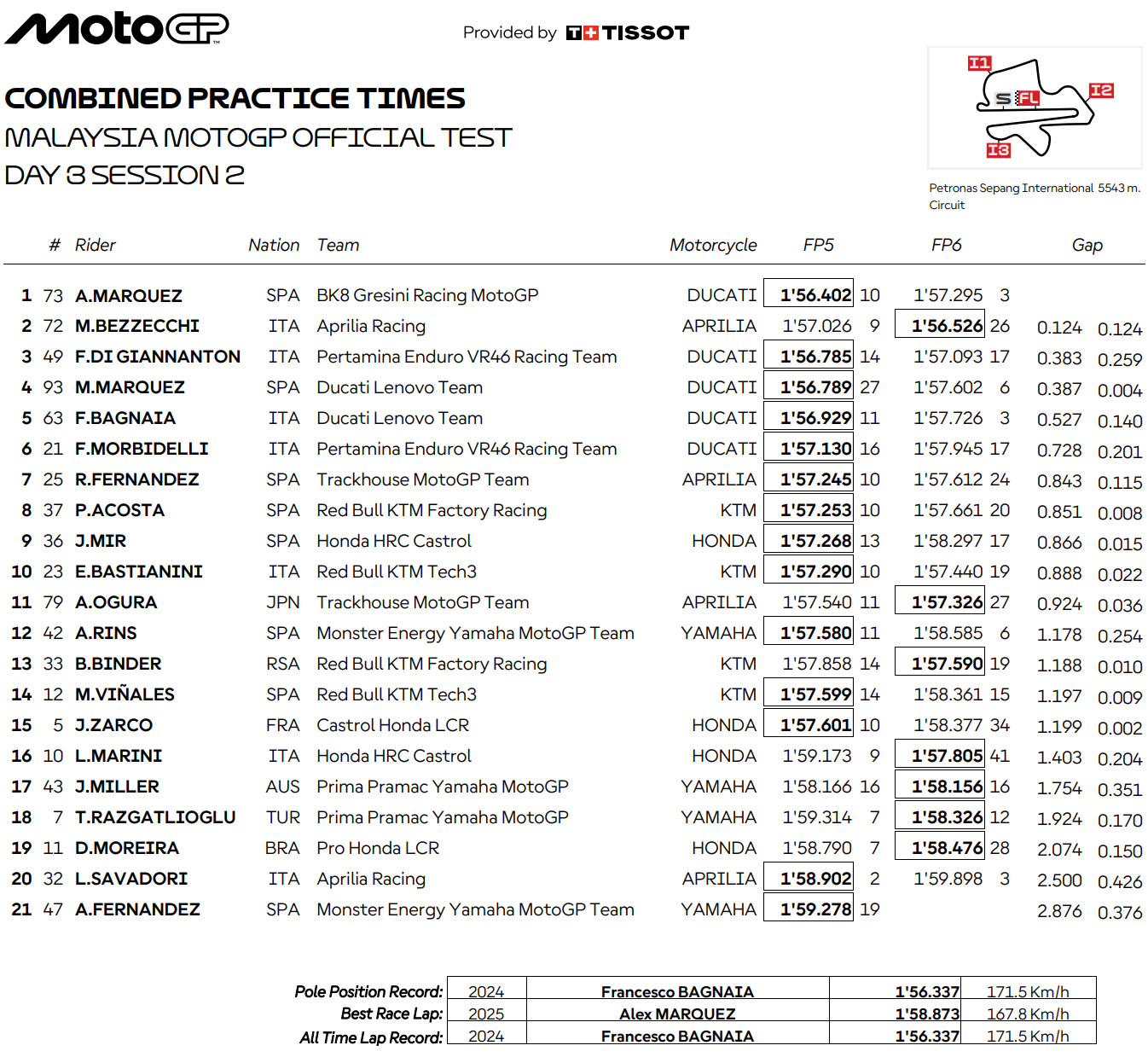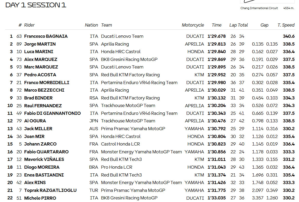 Sur les 22 titulaires de la catégorie reine, 21 sont au rendez-vous sur le circuit de Chang, seul Fermín Aldeguer (BK8 Gresini Racing MotoGP) manquant à l’appel, remplacé durant ce test et le Grand Prix par Michele Pirro.