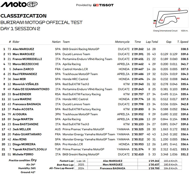 7e à 8 dixièmes d’Alex Marquez après le test en Malaisie, le numéro 25 conclut la première journée sur le circuit de Chang sixième, à 2 dixièmes du même pilote en haut du tableau, dans une zone très disputée par de nombreux autres prétendants.