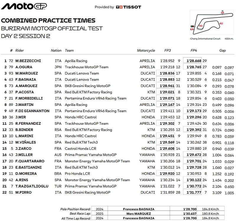 Poursuivant à Buriram le travail sur les réglages  entamé lors du test de Sepang sur sa GP25, le numéro 21 a réalisé un solide « Day 1 » malgré des températures très élevées, terminant la première journée en troisième position, en 1’29.451 au terme des 59 tours effectués.