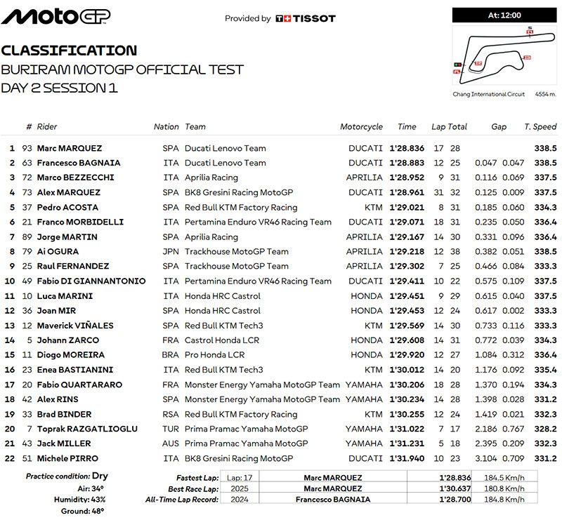 Ce matin, le 1’28.836 réalisé par Marc Márquez est intercalé entre  sa référence de 1’28.855 obtenu lors du test 2025, et le 1’28.782 arraché par le même homme lors de la qualification de l’an passé.
