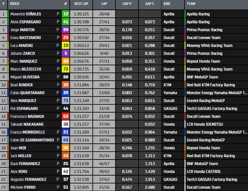 Le classement à 11h00 : Zarco (1:30.626), Viñales, Marini, Aleix Espargaró, Marc Marquez, Bastianini, Martin, Quartararo, Brad Binder et Nakagami. Onzième Bagnaia devant : Oliveira, Di Giannantonio, Morbidelli, Bezzecchi, Alex Marquez, Pol Espargaró, Mir, Miller, Pirro, Raul Fernandez et Rins.