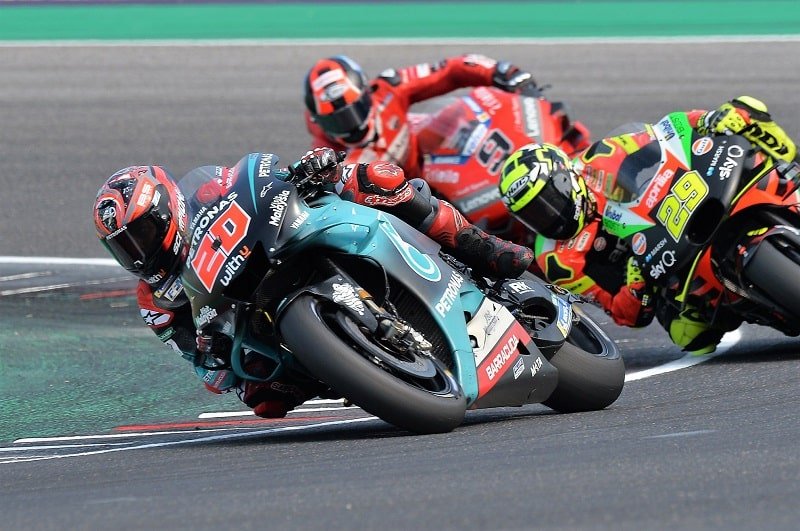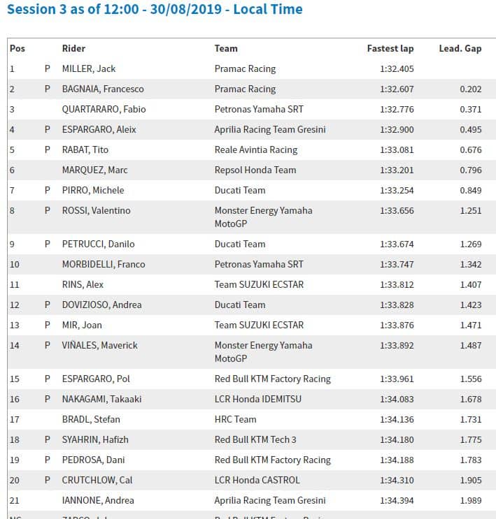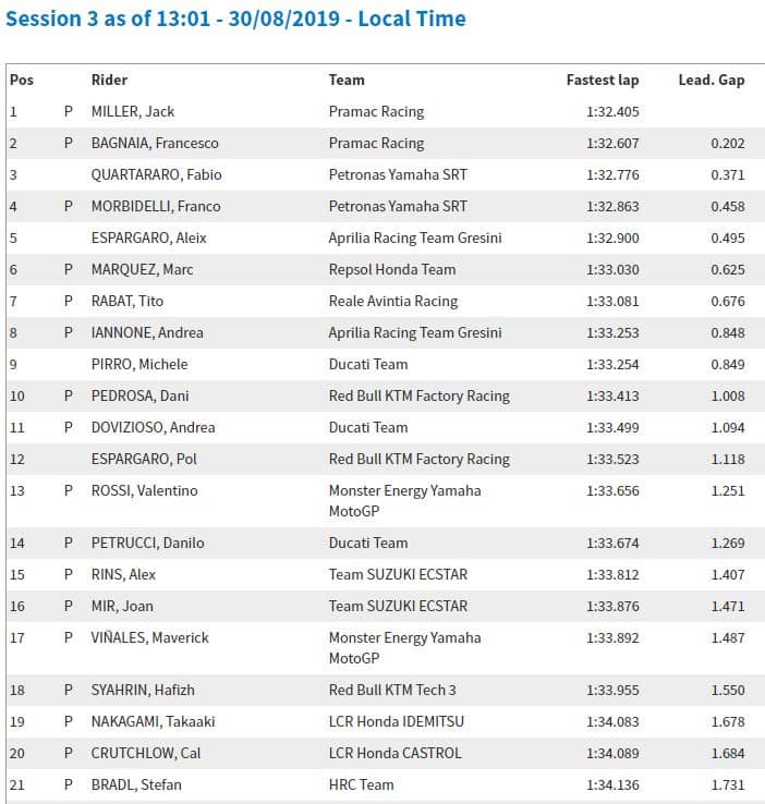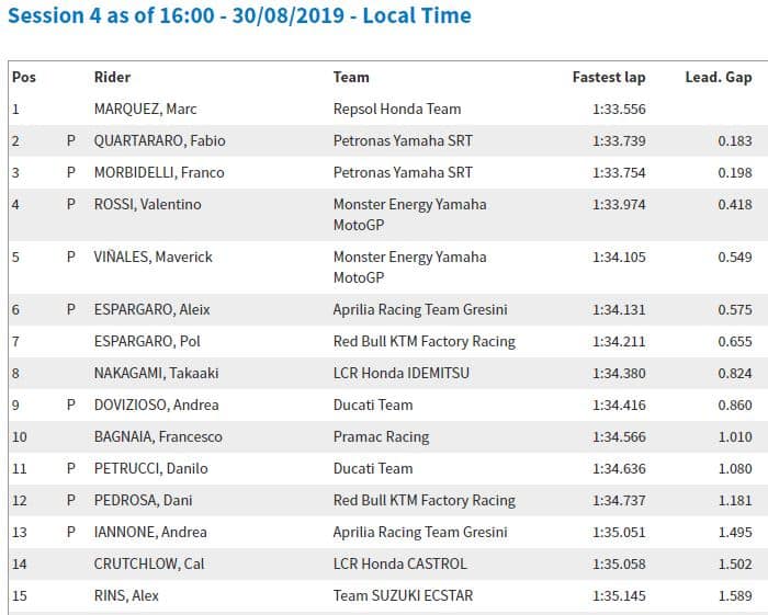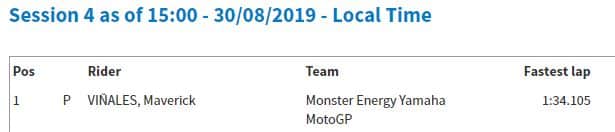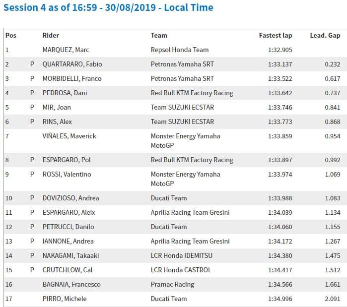 17h50 : Tiercé Yamaha grâce à Valentino Rossi troisième, à 0.3 de Fabio. Et Maverick Viñales était cinquième. Seul Bagnaia était intercalé entre les Yam en quatrième position. Marc Márquez ne roulait pas.