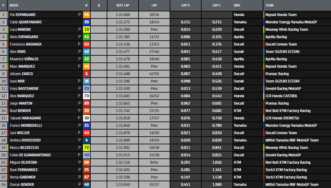 En tête du classement général, on comptait 16 pilotes en seulement sept dixièmes de seconde. On retrouvait Luca Marini avec la VR46 Ducati GP22, enfin à l’aise sur la Desmosedici. L’Italien, heureux et satisfait du travail accompli avec l’équipe, laissait derrière lui la Honda de Marc Marquez, satisfait des mises à jour sur sa machine, et l’Aprilia de Maverick Viñales.
