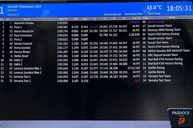 Pirro suit de même que Bezzecchi qui subtilise à Raul Fernandez le statut de meilleur rookie pour 85 millièmes. L’Espagnol reste cependant la figure de proue de KTM, à la grande joie de son écurie Tech3. Le top 5 est fermé par le toujours vaillant Sylvain Guintoli sur Suzuki, devant Remy Gardner et Darryn Binder, à moins d’une demi-seconde des meilleurs rookies. Stefan Bradl, absent lors de la première journée d’essais car sans sa Honda perdue dans le fret, suit. Kallio, Savadori et les Japonais de Yamaha ferment la marche.