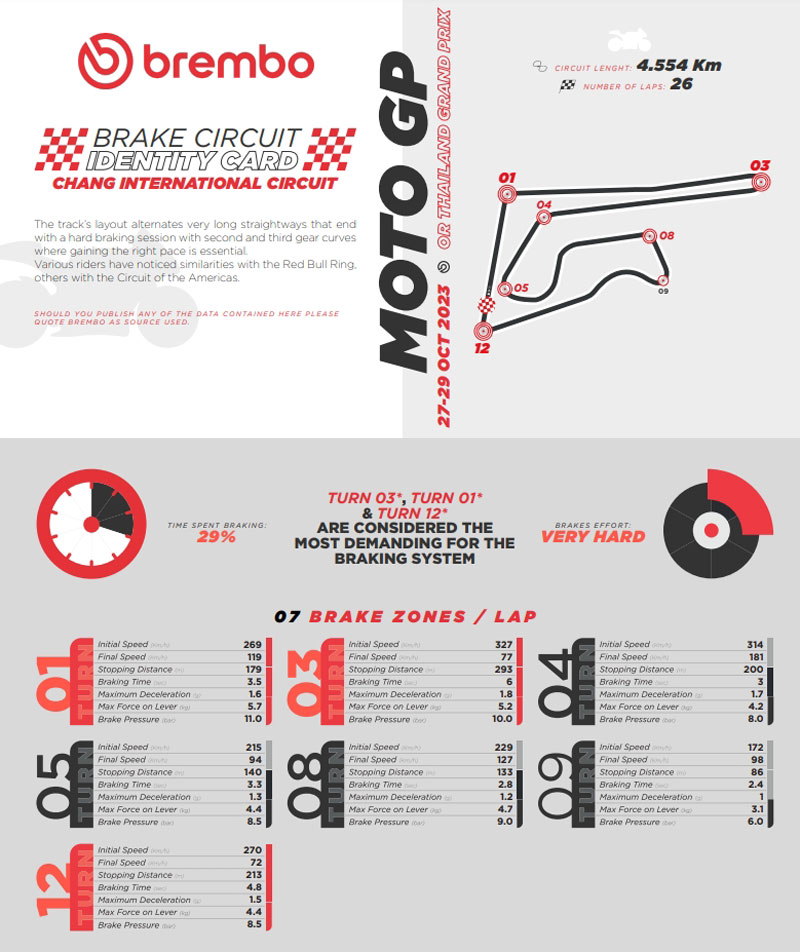 Le tour de force du MotoGP se poursuit, avec la troisième manche en trois semaines. Selon les techniciens Brembo qui travaillent en étroite collaboration avec les 22 pilotes de la catégorie reine, le circuit international de Chang est l’un des plus exigeants pour les freins. Sur une échelle de difficulté de 1 à 6, il a obtenu la note 6 ; en effet, les disques utilisés ont un diamètre de 355 mm.