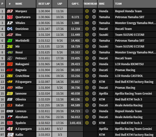 Márquez insiste et double Quartararo dans le dernier tour. Victoire de Márquez devant Quartararo et Viñales. Le pilote de Cervera décroche sa 6e couronne mondiale en MotoGP, son 8e titre toutes catégories confondues.