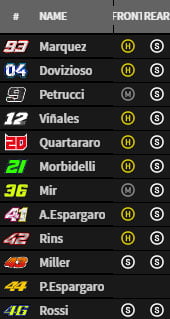 Tous les pilotes ont choisi le pneu arrière tendre tandis que les trois options ont été retenues pour l’avant.