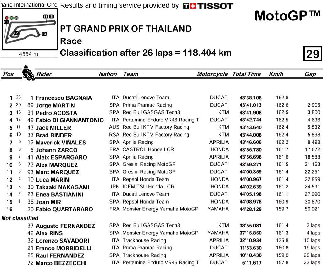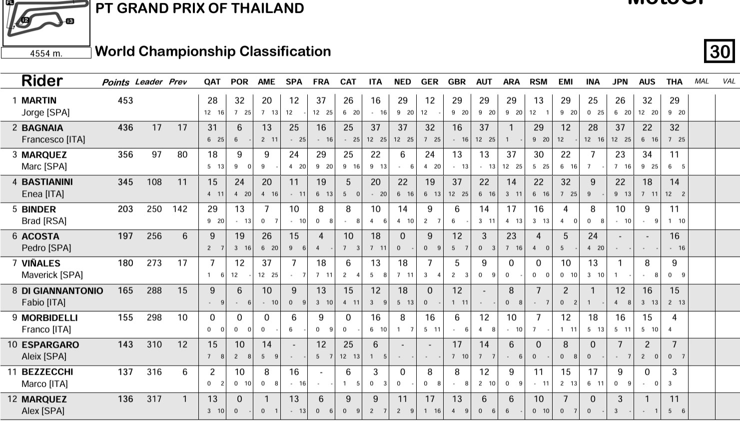 Dans un championnat à l’issue pour le moment toujours incertaine, ce Grand prix n’a pas vraiment changé la donne en tête, l’avance du leader Jorge Martin passant de 22 points à 17 devant le double champion du monde en titre Francesco Bagnaia, ni pour la 3e marche du podium final, conservée pour le moment par un Marc Marquez reprenant 3 points à son adversaire direct et en possédant dorénavant 11 d’avance.
