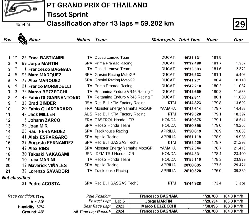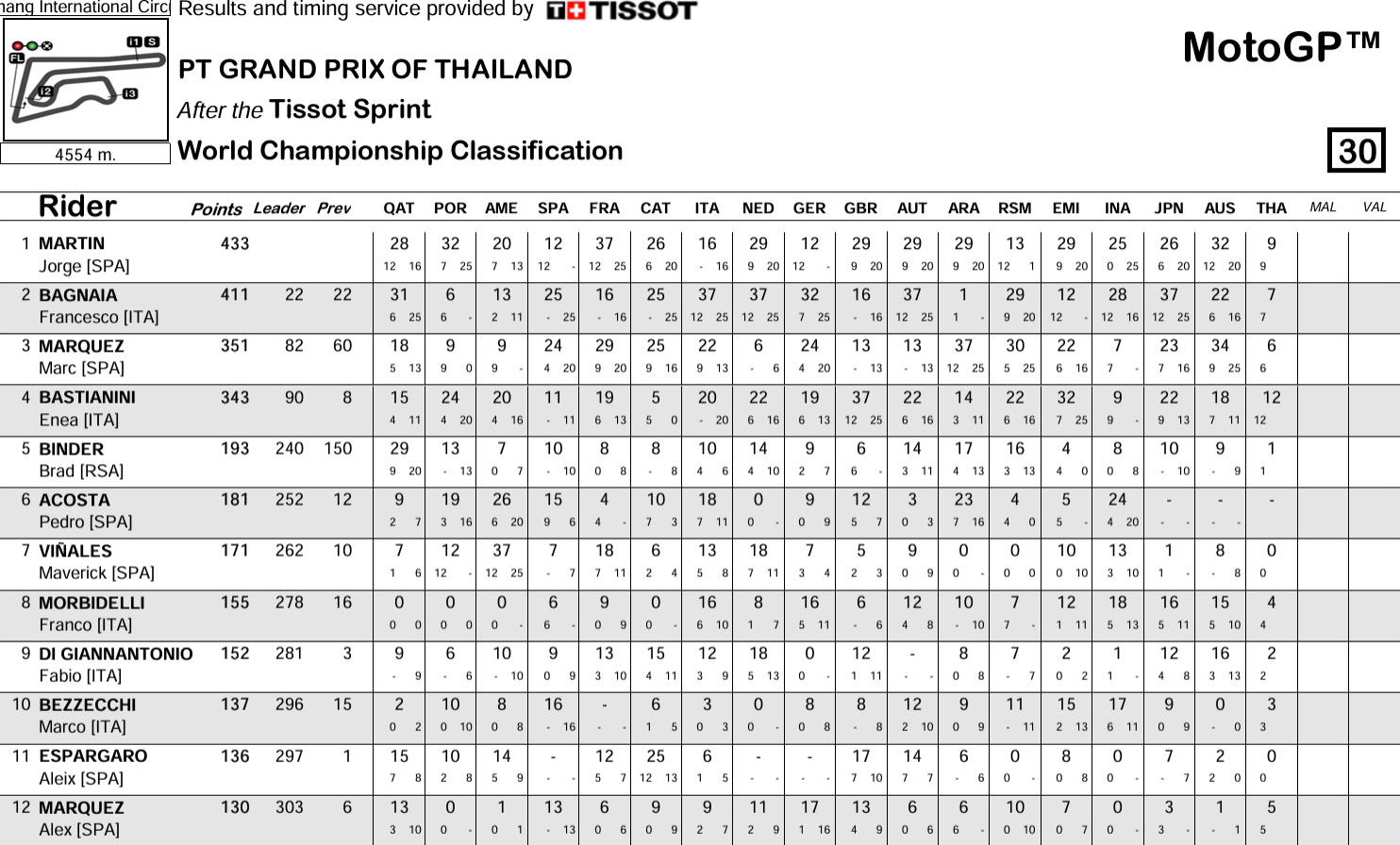 Dans un championnat à l’issue pour le moment toujours incertaine mais qui commence à pencher du côté espagnol, ce sprint n’a pas changé la donne en tête, le leader Jorge Martin passant de 20 points à 22 devant le double champion du monde en titre Francesco Bagnaia, ni pour la 3e marche du podium final, conservée pour le moment par un Marc Marquez concédant 6 points à son adversaire direct et n’en possédant plus que 8 d’avance.
