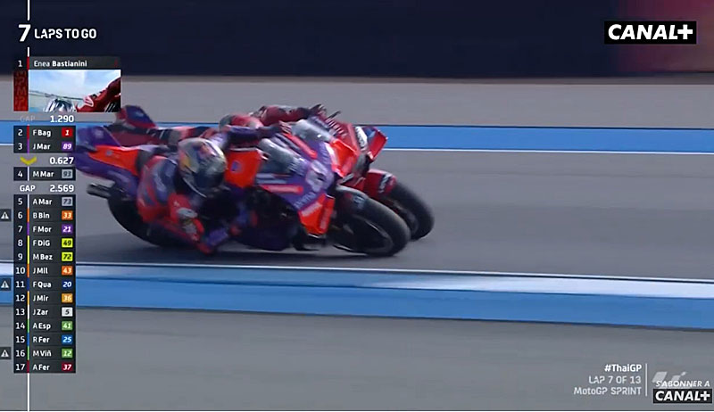 Dans un championnat à l’issue pour le moment toujours incertaine mais qui commence à pencher du côté espagnol, ce sprint n’a pas changé la donne en tête, le leader Jorge Martin passant de 20 points à 22 devant le double champion du monde en titre Francesco Bagnaia, ni pour la 3e marche du podium final, conservée pour le moment par un Marc Marquez concédant 6 points à son adversaire direct et n’en possédant plus que 8 d’avance.
