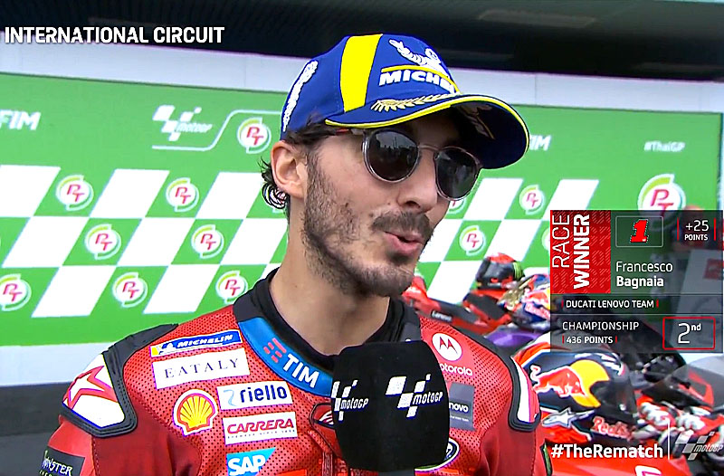 A peine descendu de sa Ducati GP24 officielle après avoir remporté le Grand Prix de Thaïlande MotoGP 2024 à Buriram, Francesco Bagnaia s’est confié devant les caméras du site officiel MotoGP.com avec la joie de s’être montré le patron dans des conditions extrêmement difficiles, quitte à en perdre un peu ses mots…