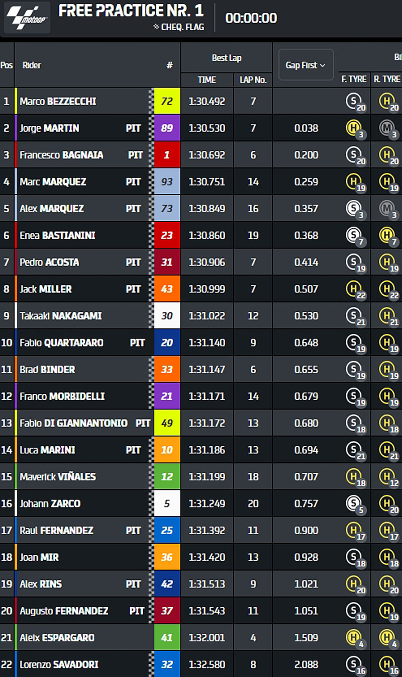 Jorge Martin parvient à s’intercaler entre les deux hommes et, à la fin du premier run, la hiérarchie est composée de Marco Bezzecchi, Jorge Martin, Francesco Bagnaia, Marc Márquez, Pedro Acosta, Jack Miller, Takaaki Nakagami, Fabio Quartararo, Alex Márquez, Franco Morbidelli, Luca Marini, Fabio Di Giannantonio, Raul Fernandez, Alex Rins, Enea Bastianini, Augusto Fernandez, Joan Mir, Johann Zarco, Aleix Espargaro, Maverick Vinales, Lorenzo Savadori et Brad Binder qui s’élance à peine.