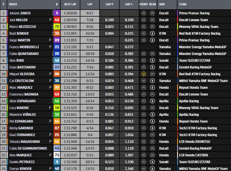 Johann Zarco dégaine un 1’30.830 qui le positionne en tête, devant Miller, Bezzecchi, Martin et Morbidelli qui devance Quartararo.