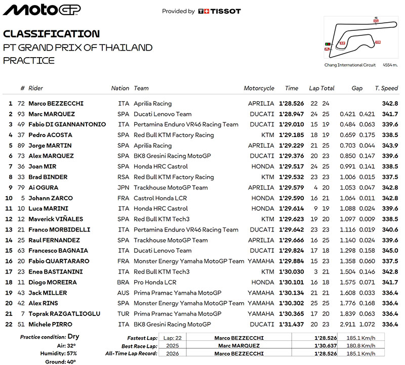 Résultat de la Practice au Grand Prix de Thaïlande MotoGP 2026 :
