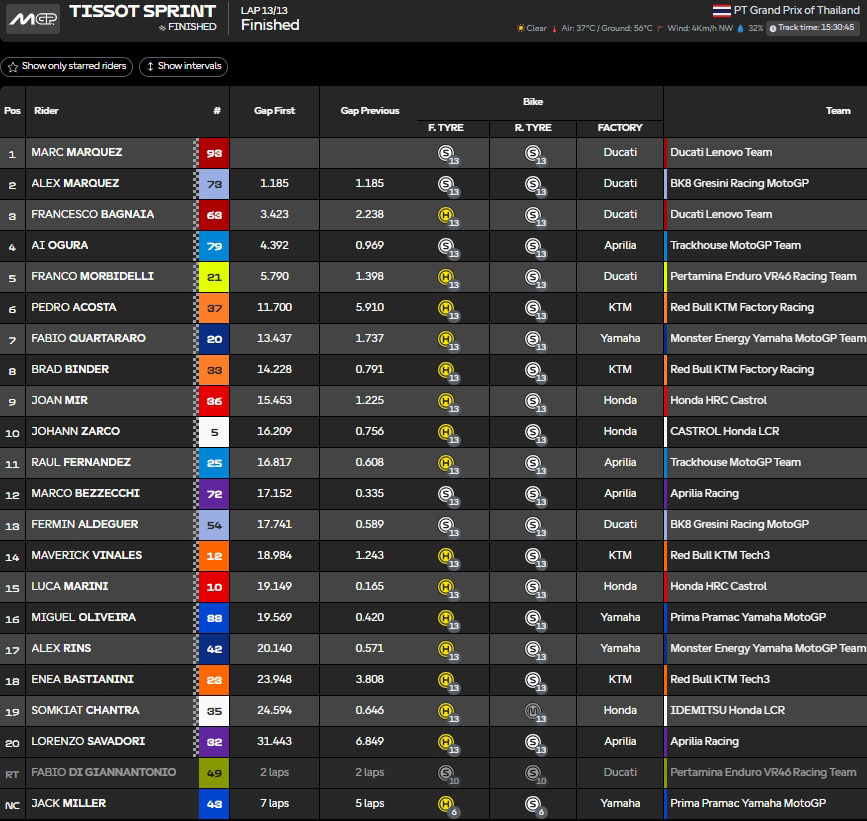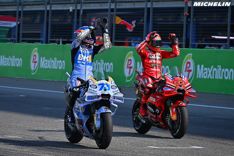 Ce samedi, les températures ont atteint des niveaux extrêmes, avec un asphalte à 60°. Cela n’a pas empêché quasiment les pilotes de choisir le pneu arrière tendre, et même les deux frères Márquez de choisir le pneu avant du même acabit, tout comme Ai Ogura, Marco Bezzecchi et Fermin Aldeguer, avec le résultat que l’on connaît ! Jusqu’à ces dernières années, des températures élevées avaient tendance à impliquer des gommes plus dures, mais Michelin a mystérieusement su réduire à néant cette approche sans doute trop simpliste…