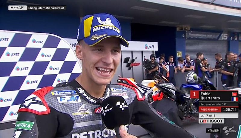 A peine descendu de sa Yamaha M1 satellite du team Petronas Yamaha SRT après avoir obtenu la pole position sur la grille de départ du Grand Prix de Thaïlande, Fabio Quartararo s’est confié devant la caméra du site MotoGP.com avec un moral au beau fixe...