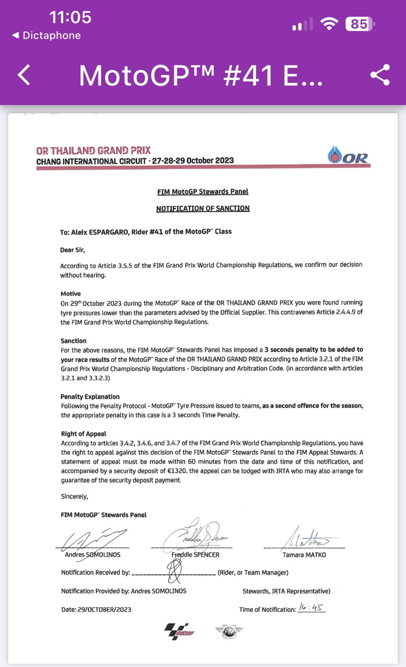 On croyait donc le classement entériné, mais c’était sans compter sur l’analyse des pressions des pneumatiques durant la course. Et là, pour la première fois de l’année, après quelques avertissements déjà donnés à une demi-douzaine de pilotes, une sanction tombait sur Aleix Espargaro, récidiviste d’avoir roulé avec une pression trop basse sur son Aprilia RS-GP.