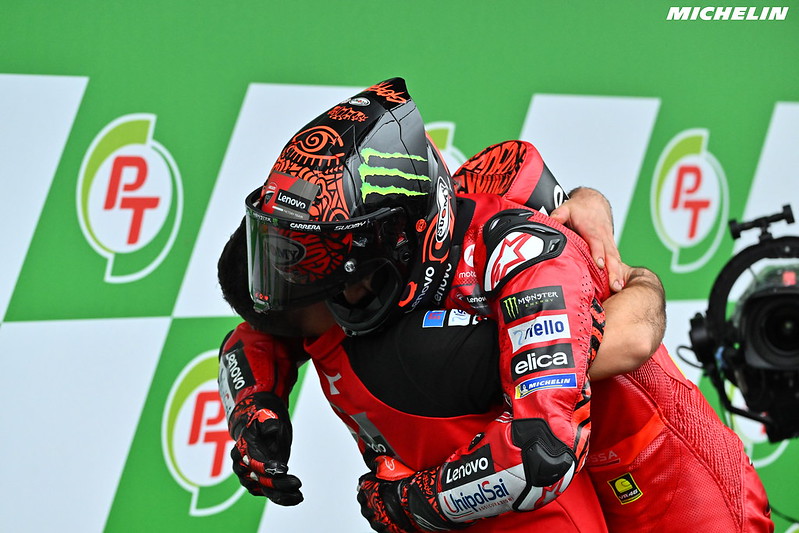 Francesco Bagnaia : « Oui, je suis très fier et très heureux, et je veux dédier cela à mon équipe. Après le warm up, nous nous sommes assis et nous avons essayé de comprendre ce qui n’allait pas ou ce qui manquait, parce qu’en termes de freinage, je perdais du temps et je n’étais pas satisfait de mes sensations en entrée de piste. Je me suis donc assis et j’ai essayé d’expliquer le mieux possible ce que je ressentais et ils ont eu la bonne intuition, donc je suis très heureux d’avoir gagné aujourd’hui. La victoire d’aujourd’hui est importante pour le championnat, absolument, parce que maintenant nous avons 17 points (de retard), mais c’est plus pour le mental et la confiance. Et rien de plus, je suis juste très heureux.