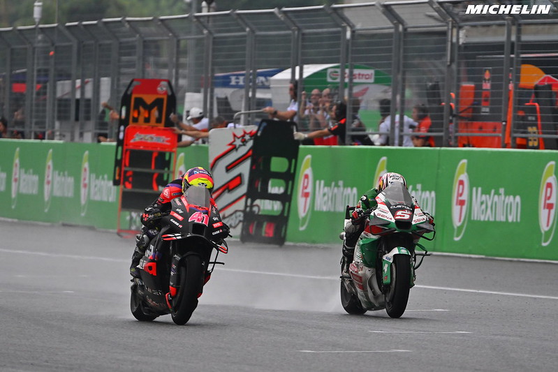 Au micro de Jules Deremble, il raconte : « Ouais, mais j’étais pas du tout à l’aise et ça n’a pas non plus énormément séché. Mais c’est là où j’ai une petite contrariété, parce que je peux rien faire, je peux rien faire. Et ce qui est en tout cas positif, c’est que vraiment sous la pluie, ça amplifie les problèmes du sec, et du coup j’ai plus le temps de comprendre et je peux presque donner une meilleur info. Du coup, je pense maintenant cerner de mieux en mieux la zone où on va devoir évoluer. Mais du coup je trouve que je n’étais pas trop mal parti. En 2 ou 3 virages, j’avais su prendre un peu mes marques, mais ensuite, quand les autres se sont sentis mieux, je glissais trop ! Et on sent que ça glisse, on peut se faire surprendre, du coup par crainte de se faire surprendre on essaie de garder une petite marge, mais je vois que je perdais trop de temps. Et après, derrière les autres pilotes, il faisait chaud aussi et le pneu avant montait en température, ça glissait. À un moment, je me suis dit “c’est peut être moi qui ne freine pas assez”, mais quand j’ai essayé de freiner plus, j’ai glissé plusieurs fois et ça m’a poussé à faire des erreurs. Après, j’ai essayé de patienter en sachant qu’à un moment donné les autres allaient quand même plus user le pneu arrière, et que moi j’allais prendre l’avantage. Belle bagarre avec Alex (Marquez), parce qu’il n’a pas lâché. A chaque fois j’étais très surpris qu’il repique à l’intérieur, donc il y a eu du plaisir sur la course, et à la fin pouvoir aussi avoir Aleix et être concentré pour prendre la 8e place, c’est quand même cool ! Mais bon, j’évite tellement de choses, ah, j’avais les boules, parce que franchement, bah voilà, on va dire, c’est mes conditions. »