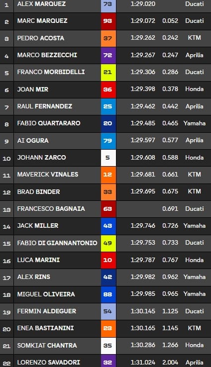 Fin de séance : AMarquez prend la main en 1.29.020s devant MMarquez, Acosta, Bezzecchi, Morbidelli, Mir, RFernandez, Quartararo, Ogura et Zarco. Bagnaia est 13e, ce dernier a été gêné par Morbidelli, Sanction à venir??