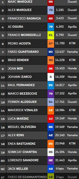 Après 2 tours, le top10 se compose de : MMarquez, AMarquez, Bagnaia, Ogura, Morbidelli, Miller, Quartararo, Binder, Acosta et Zarco.